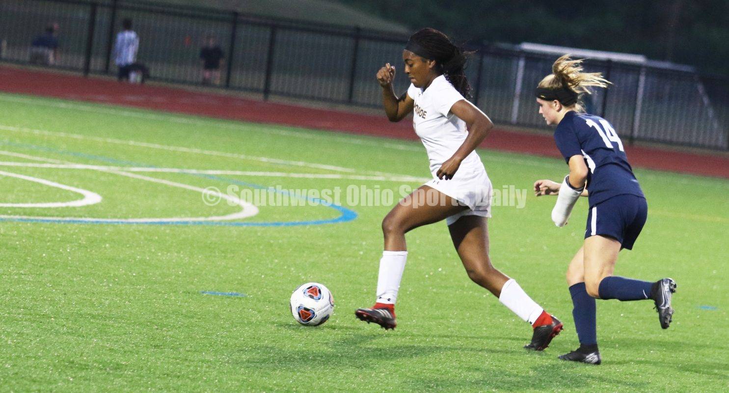 Monroe High School's Makala Woods dribbles past Oakwood's Elizabeth Grant (14) on Sept. 19, 2019, during a Southwestern Buckeye League girls soccer game at Lane Stadium in Oakwood. The visiting Hornets won 4-0. RICK CASSANO/STAFF