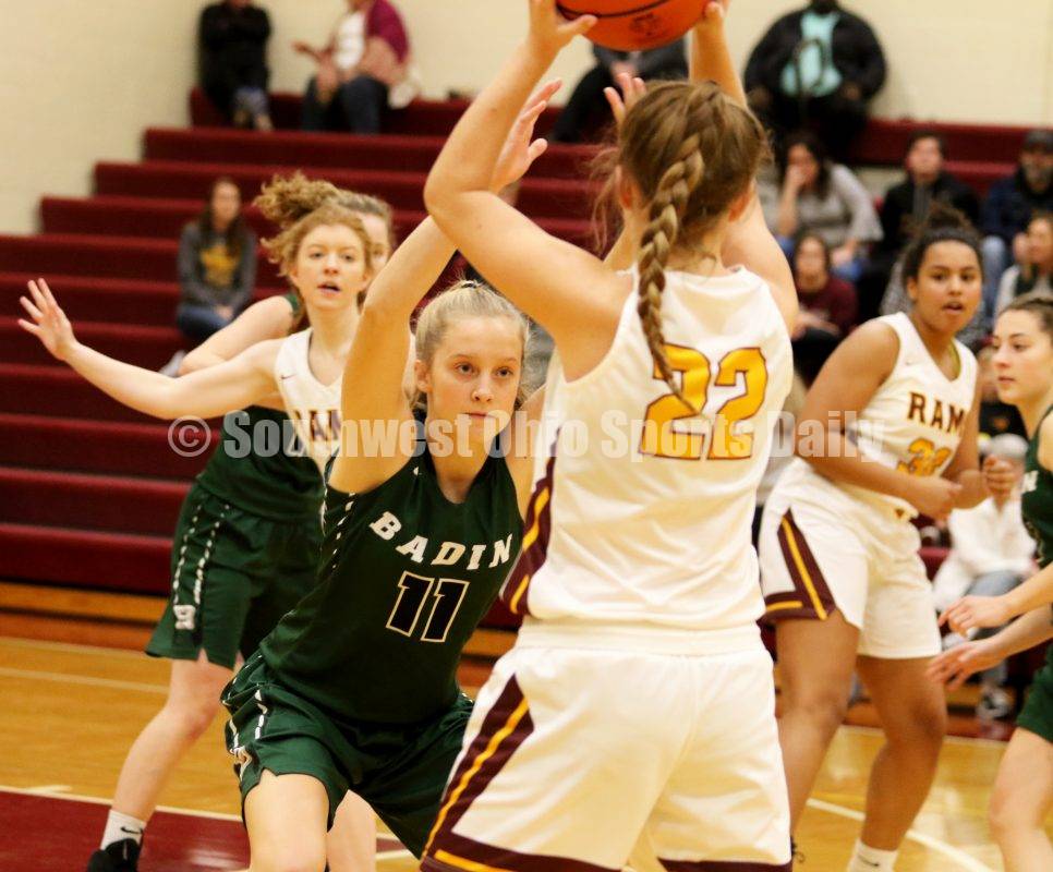Badin High School's Jada Pohlen (11) defends Brooklyn Breaker of Ross on Nov. 26, 2019, during a Butler County girls basketball game at Ross. Badin won 41-16. RICK CASSANO/STAFF