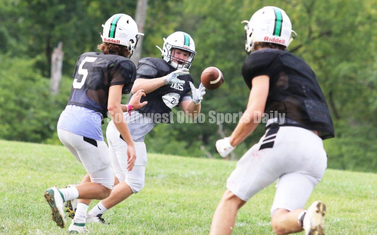Badin High School senior running back Dallas Rawlings takes a pitch from quarterback Landyn Vidourek on Aug. 18, 2020, during a football practice at the school in Hamilton. RICK CASSANO/STAFF