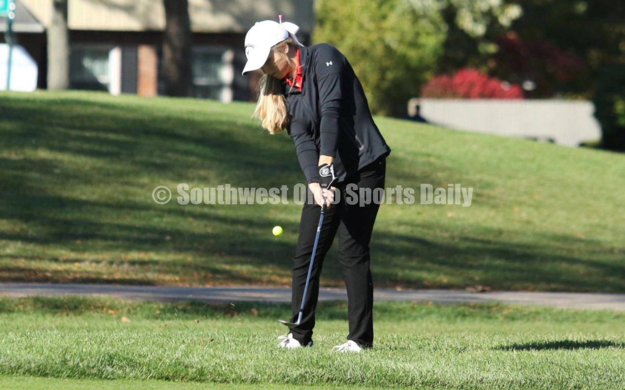 Fenwick High School's Halley McNair chips the ball toward the green Oct. 17, 2020, during the Division II state girls golf tournament at Ohio State University's Gray Course in Upper Arlington. RICK CASSANO/STAFF