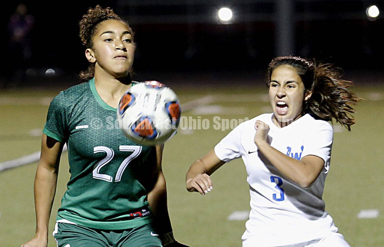 Badin High School defender Jayla Starks takes a pass in front of Wyoming defender Sophia Wilhelm during a Division II district semifinal girls soccer game at Fairfield Alumni Stadium on Oct. 27, 2020. Badin won 1-0. E.L. HUBBARD/CONTRIBUTOR