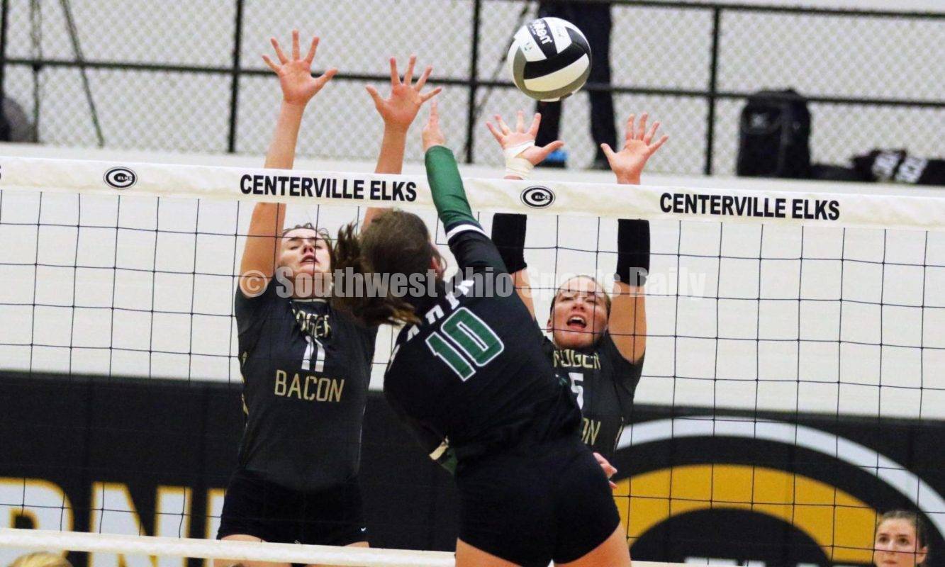 Badin High School's Lauren Trusock (10) sends a shot toward Roger Bacon's Abbie Schneider (11) and Grace Wilking (5) on Nov. 5, 2020, during a Division II regional girls volleyball semifinal at Centerville. Bacon won 34-36, 25-21, 25-23, 25-23. RICK CASSANO/STAFF