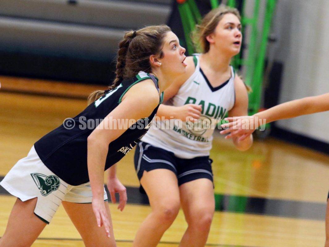 Badin High School's Lauren Grawe (left) keeps her eyes on the ball Nov. 13, 2020, during a girls basketball practice at Mulcahey Gym in Hamilton. RICK CASSANO/STAFF