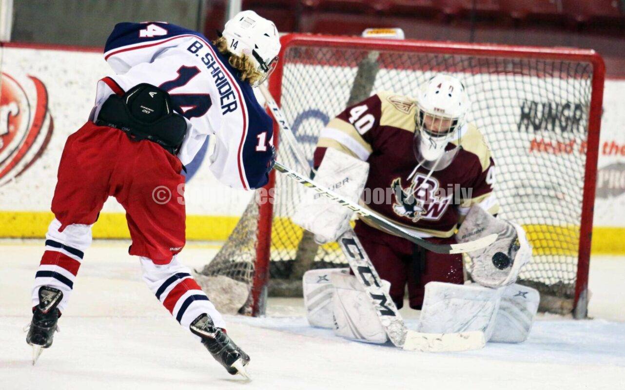 Talawanda High School's Ben Shrider scores on Columbus Watterson goaltender Andrew Burri on Dec. 20, 2020, during a hockey game at Miami University's Steve Cady Arena. Talawanda won 10-2. RICK CASSANO/STAFF
