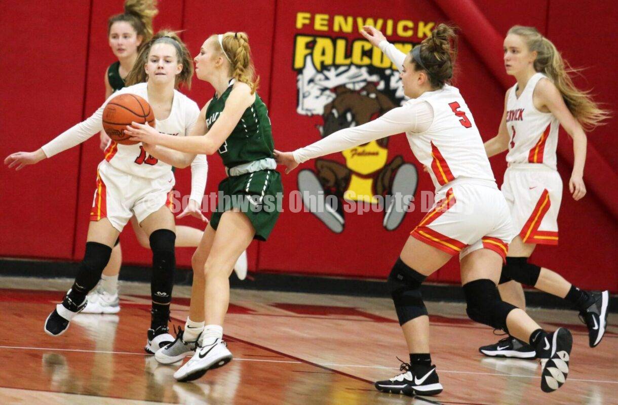 Badin High School's Morgan Dixon makes a pass between Fenwick's Julia Capell (5) and Madalyn Mahoney on Jan. 9, 2021, during a Greater Catholic League Coed Division girls basketball game at Fenwick. The visiting Rams won 50-44. RICK CASSANO/STAFF