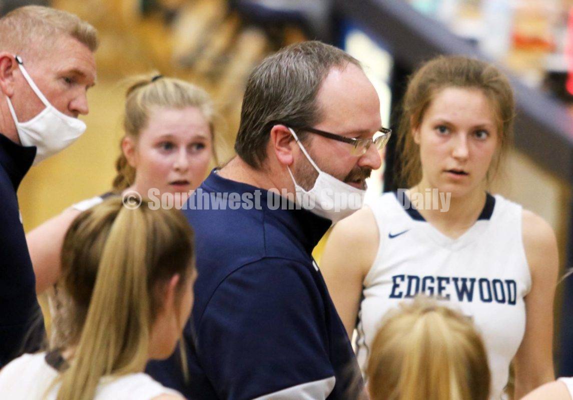 Edgewood High School coach Matt Tolliver talks to his team in a timeout Nov. 24, 2020, during a girls basketball game against Monroe at Ron Kash Court in St. Clair Township. Host Edgewood won 40-34. RICK CASSANO/STAFF