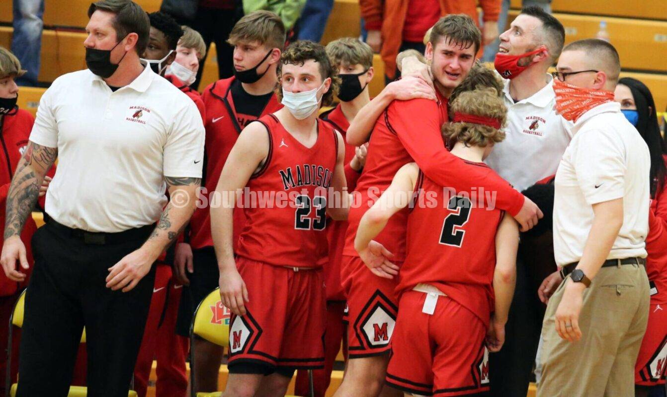 Madison High School coach Shane Richardson hugs his players Feb. 24, 2021, at the end of a Division III sectional boys basketball game against Summit Country Day at Western Brown. Summit won 52-38. RICK CASSANO/STAFF