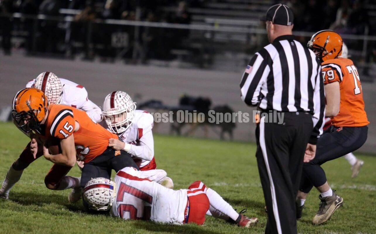Carlisle High School's Scottie Bruns (27), Bryce Brown (left) and Carson Burney tackle Versailles' Landon Henry (15) on Nov. 6, 2021, during a Division V, Region 20 football playoff game at H.B. Hole Field in Versailles. The host Tigers won 34-8. RICK CASSANO/STAFF