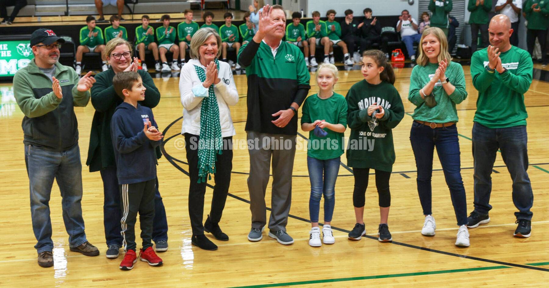 Former Badin High School coach Gerry Weisgerber waves to the crowd as he stands with his family Dec. 30, 2021, at a boys basketball game against Summit Country Day at Mulcahey Gym in Hamilton. Badin won 50-45 as the court was dedicated in Weisgerber's honor. RON ALVEY/CONTRIBUTOR