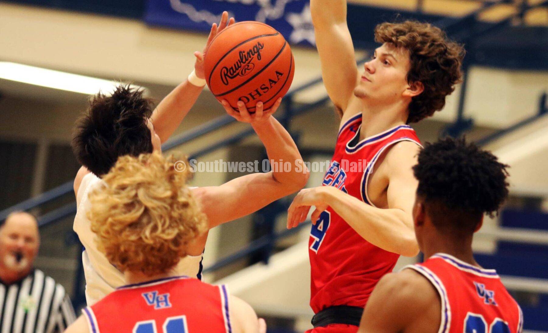 Hamilton High School's Cooper Matthews shoots against Alex Armstrong of Vestavia Hills (Ala.) on Dec. 30, 2021, during a boys basketball game at the Hamilton Athletic Center. Vestavia Hills won 62-42. RICK CASSANO/STAFF