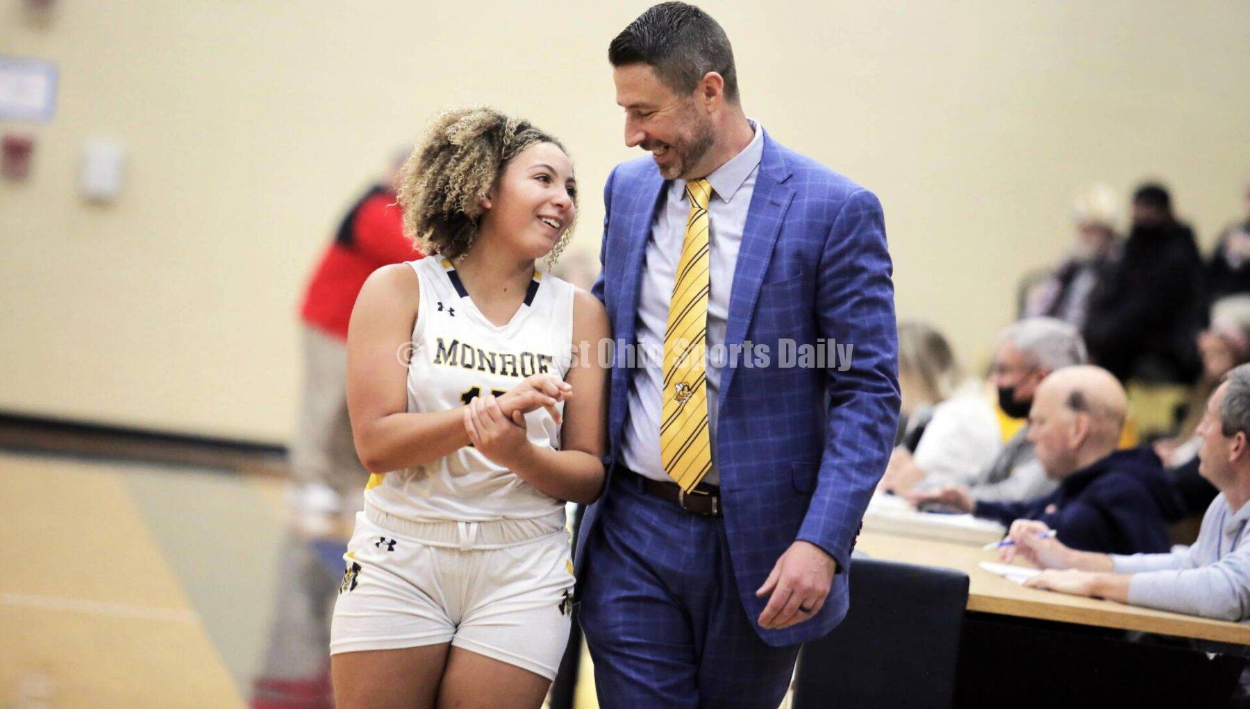 Monroe High School coach Chad Adolph greets Cadence Boyd as she comes out of the game for good Jan. 6, 2022, at a Southwestern Buckeye League girls basketball contest against Franklin at Monroe. The host Hornets won 52-39. RICK CASSANO/STAFF