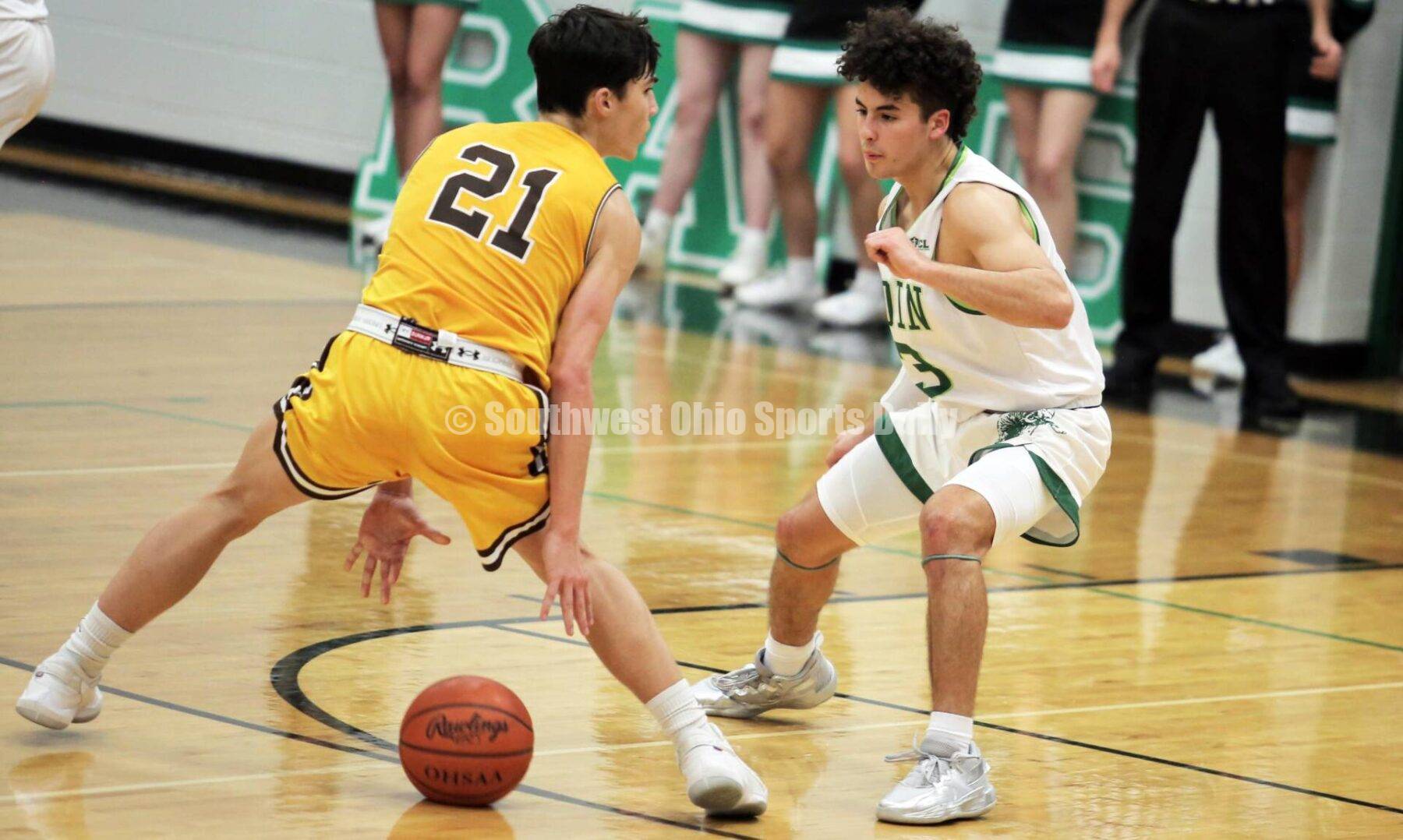 Badin High School's Diego DeCello defends Kettering Alter's A.J. Leen (21) on Jan. 9, 2022, during a Greater Catholic League Coed Division boys basketball game at Badin. Alter won 81-68. RICK CASSANO/STAFF