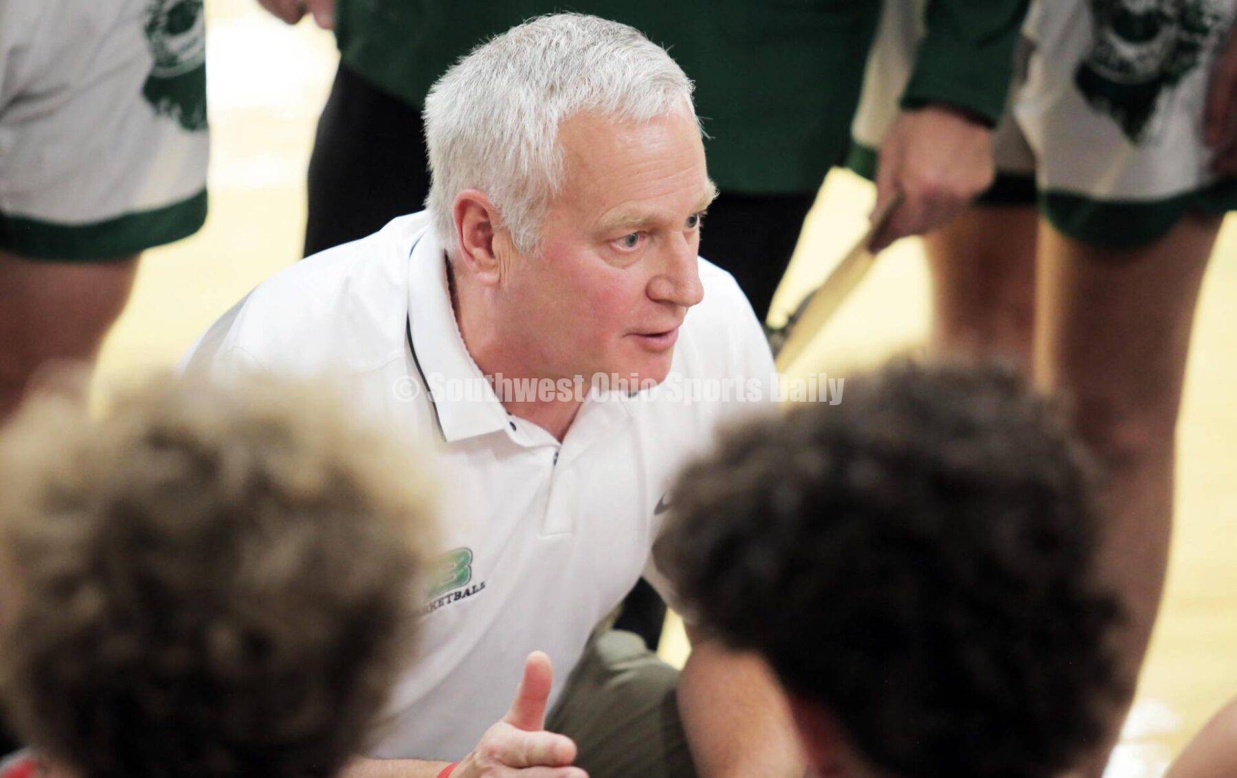 Badin High School coach Pat Kreke talks to his team in a timeout Jan. 9, 2022, during a Greater Catholic League Coed Division boys basketball game against Kettering Alter at Badin. Alter won 81-68. RICK CASSANO/STAFF