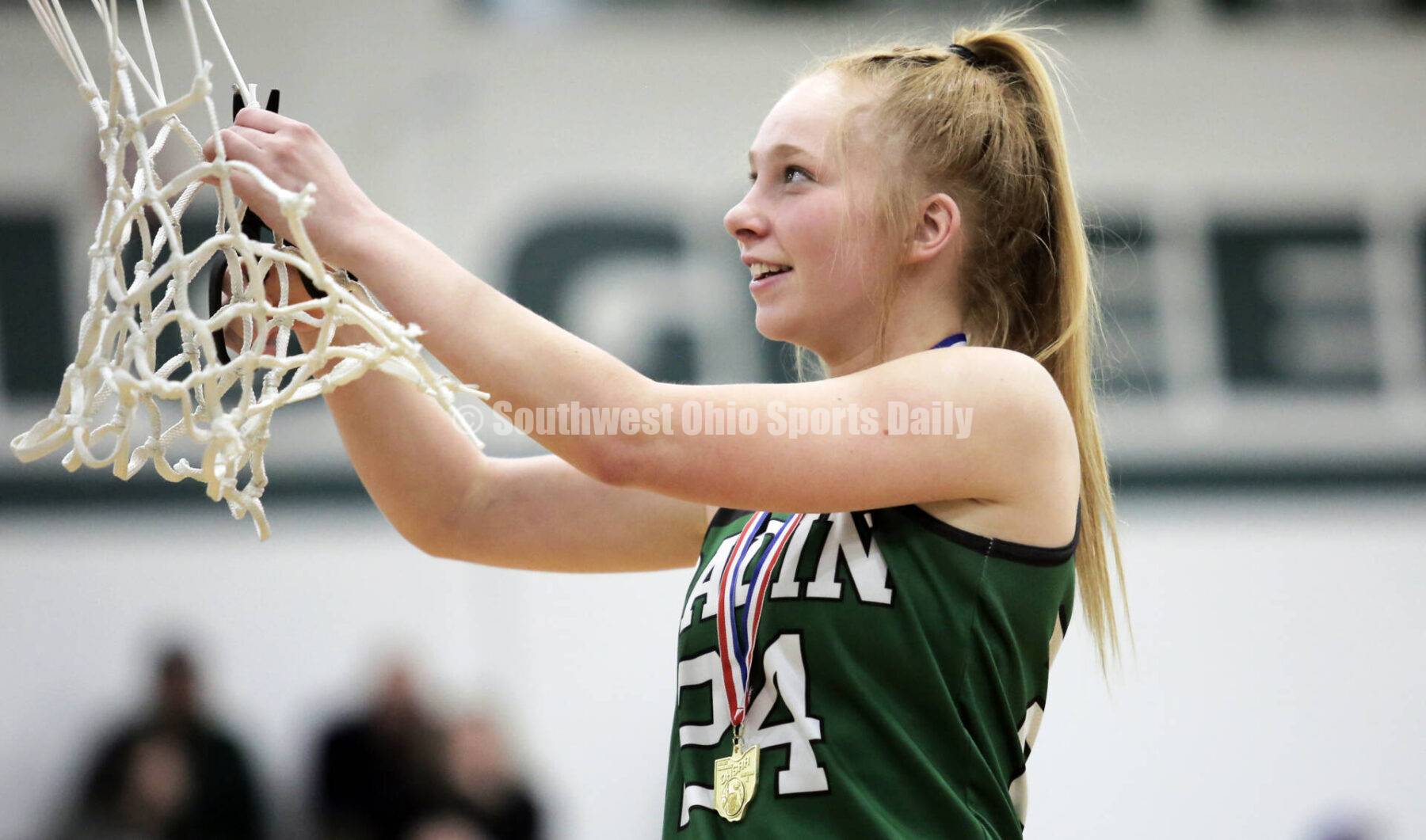 Badin High School's Morgan Dixon helps cut down the net Feb. 25, 2022, after the Rams defeated Trotwood-Madison 47-31 in a Division II district girls basketball final at Mason. RICK CASSANO/STAFF