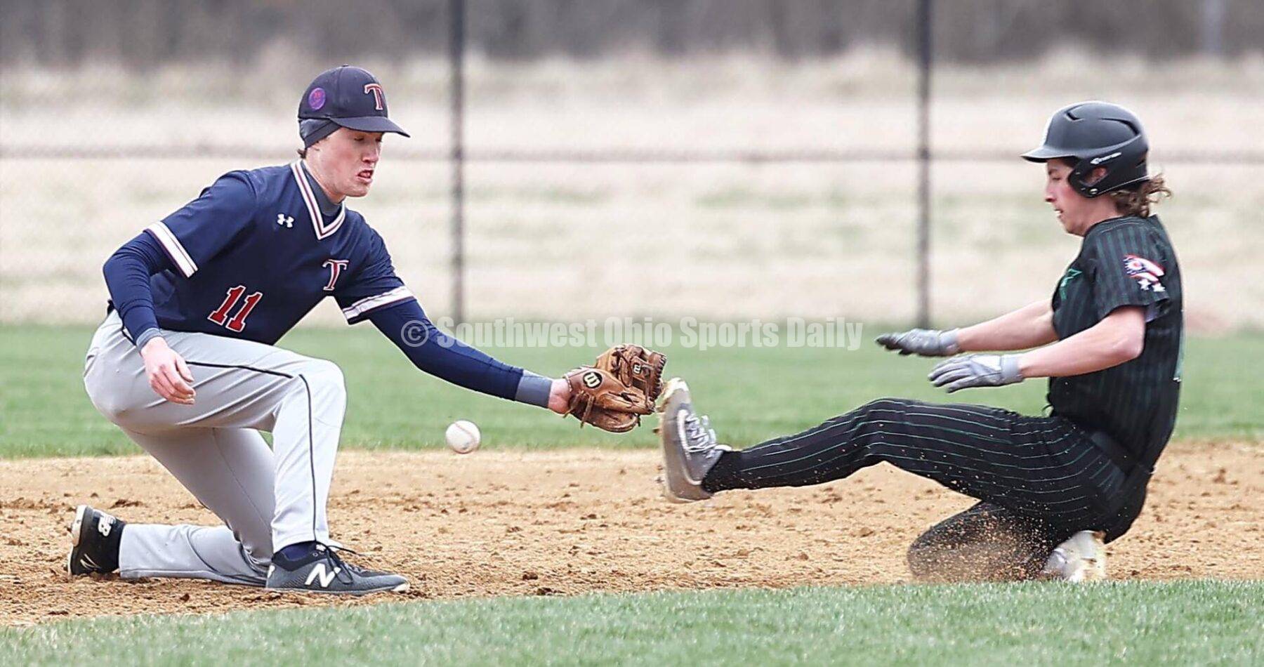 Badin High School's Mark Holderbach steals second base as Talawanda's Parker Geshan tries to field the throw March 29, 2022, during a baseball game at Talawanda. Badin won 7-1. TONY TRIBBLE/CONTRIBUTOR