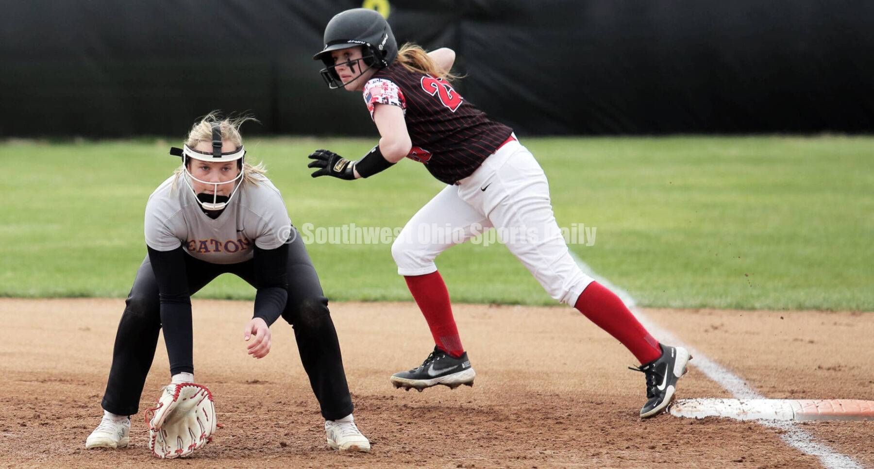 Madison High School's Samantha Swartz takes off behind Eaton first baseman Macy Wright on April 7, 2022, during a Southwestern Buckeye League softball game at Madison. The visiting Eagles won 4-1. RICK CASSANO/STAFF