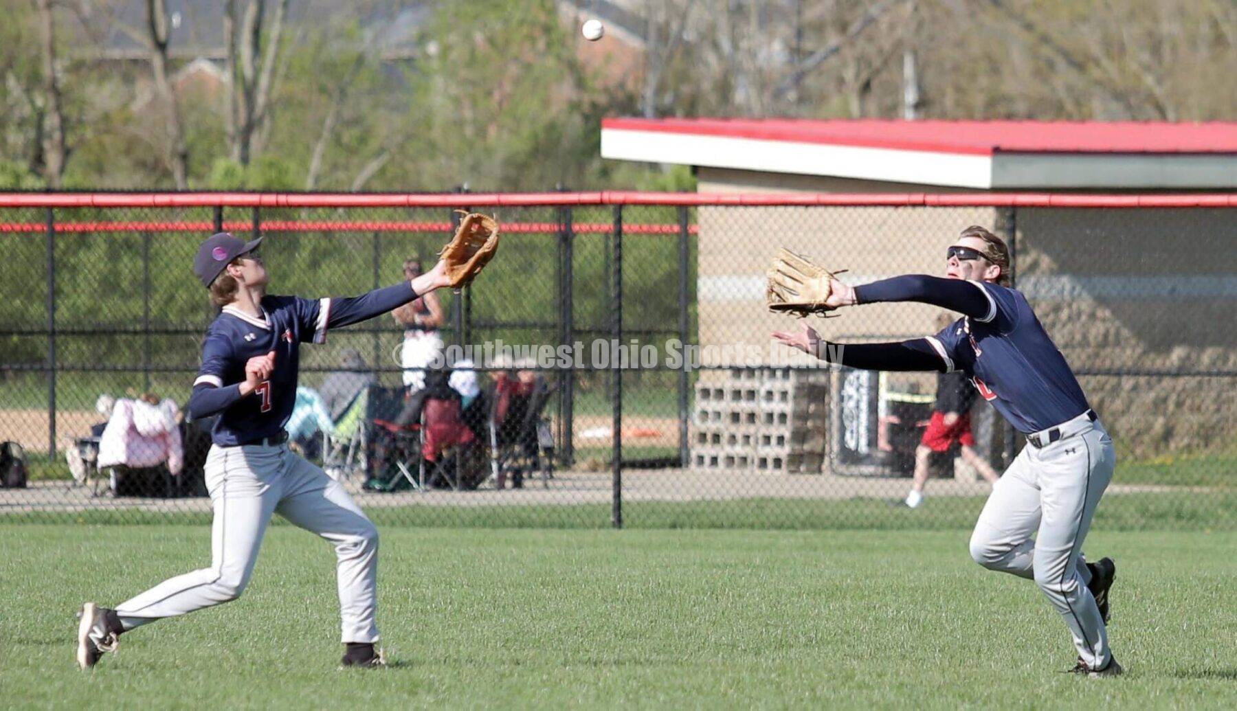 Talawanda High School right fielder Mason Birkemeier is about to make a catch behind second baseman Blake Puckett on April 25, 2022, during a Southwest Ohio Conference baseball game against Harrison in Oxford. Talawanda won 3-0. RICK CASSANO/STAFF