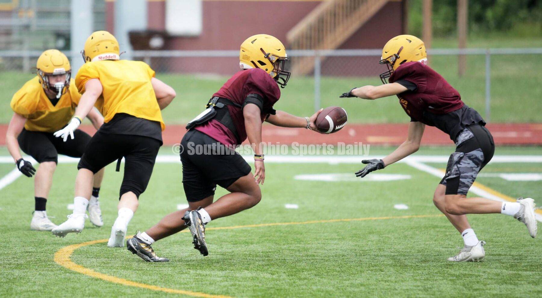 Ross High School quarterback Jaye Warren makes a handoff Aug. 1, 2022, during a football practice at Robinson Field in Ross Township. RICK CASSANO/STAFF