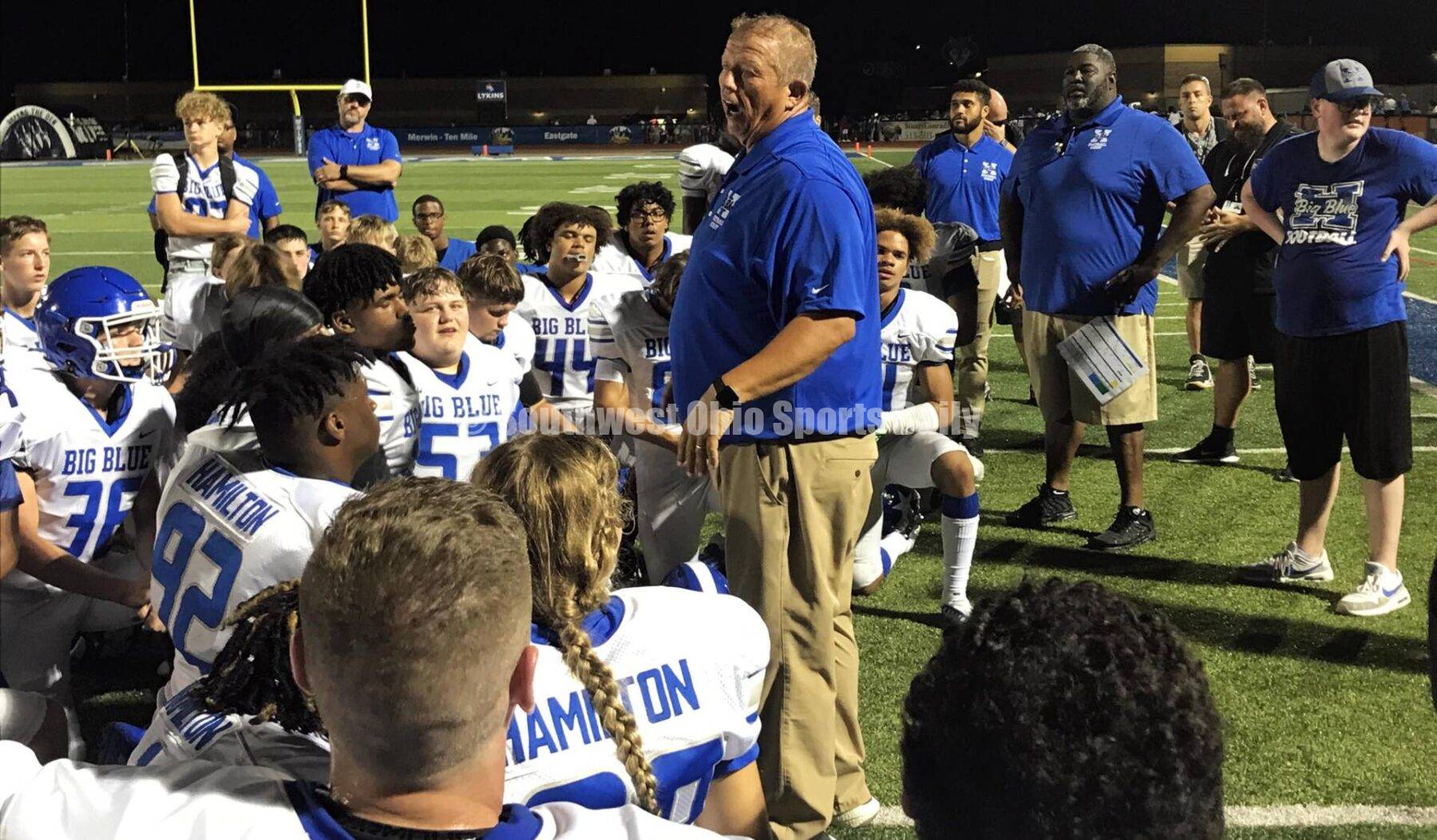 Hamilton High School football coach Arvie Crouch addresses his team Aug. 19, 2022, after Big Blue's season-opening 28-9 victory at West Clermont. SKIP WEAVER/CONTRIBUTOR