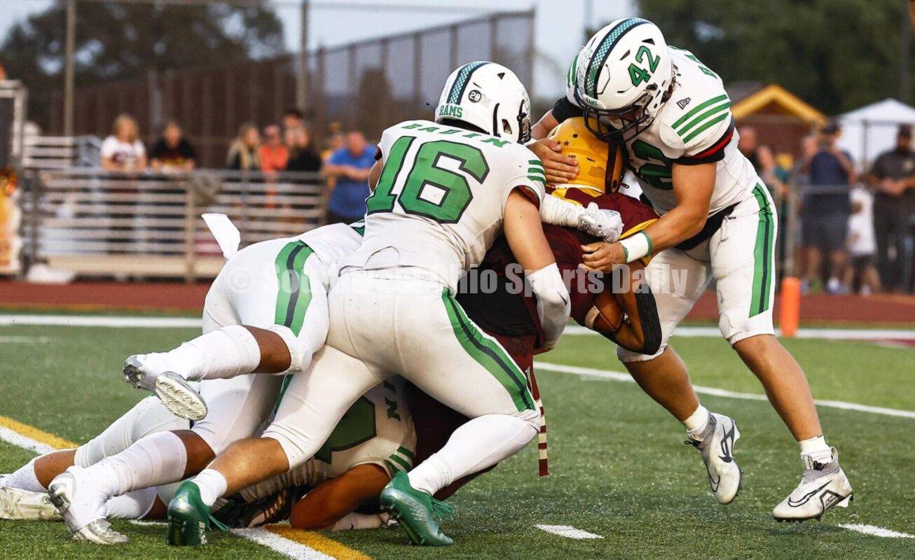 Badin High School's Reese Anzalone (16) and Nate Ostendorf (42) make it hard for Ross to run the ball Sept. 16, 2022, during a football game at Ross. Badin won 23-0. WAYNE LITMER/CONTRIBUTOR