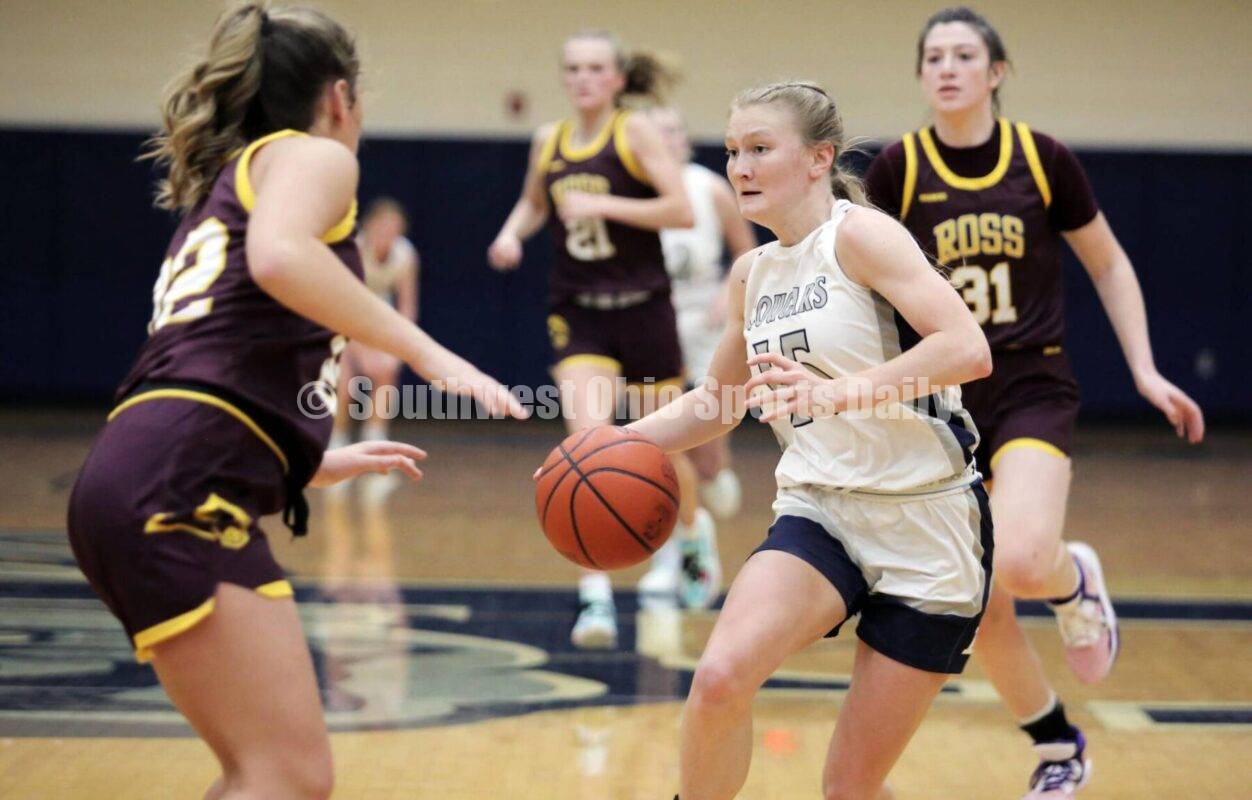 Edgewood High School's Rylie Homan pushes the ball up the floor Dec. 14, 2022, during a Southwest Ohio Conference girls basketball game against visiting Ross in St. Clair Township. Edgewood won 47-42. RICK CASSANO/STAFF