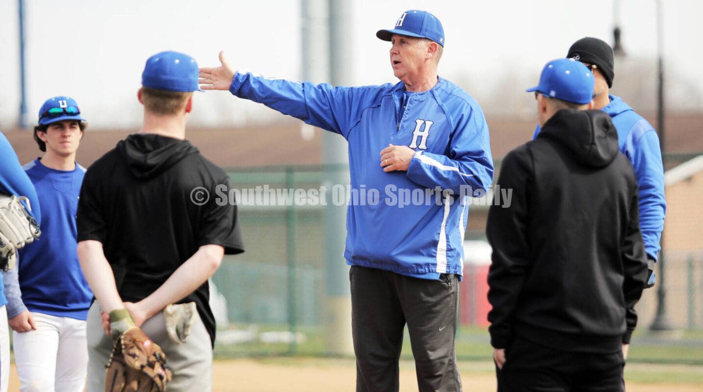 Hamilton High School coach Joey Lewis gives instructions March 21, 2023, during a baseball practice at Stang Field in Hamilton. RICK CASSANO/STAFF