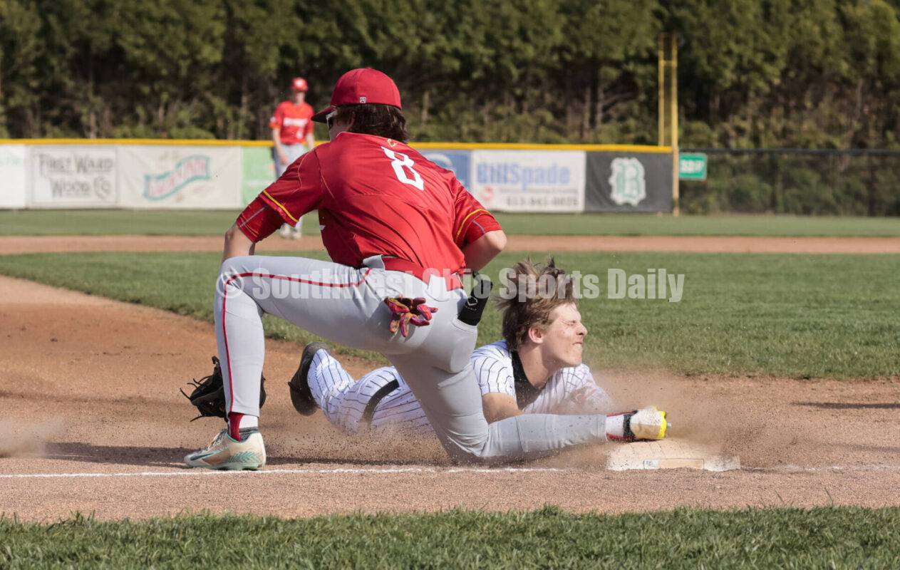 Badin High School's Brycen Fox beats the tag of Fenwick third baseman Caleb Hartman on April 19, 2023, during a Greater Catholic League Coed Division baseball game at Alumni Field in Hamilton. Badin won 11-1 in six innings. WAYNE LITMER/CONTRIBUTOR