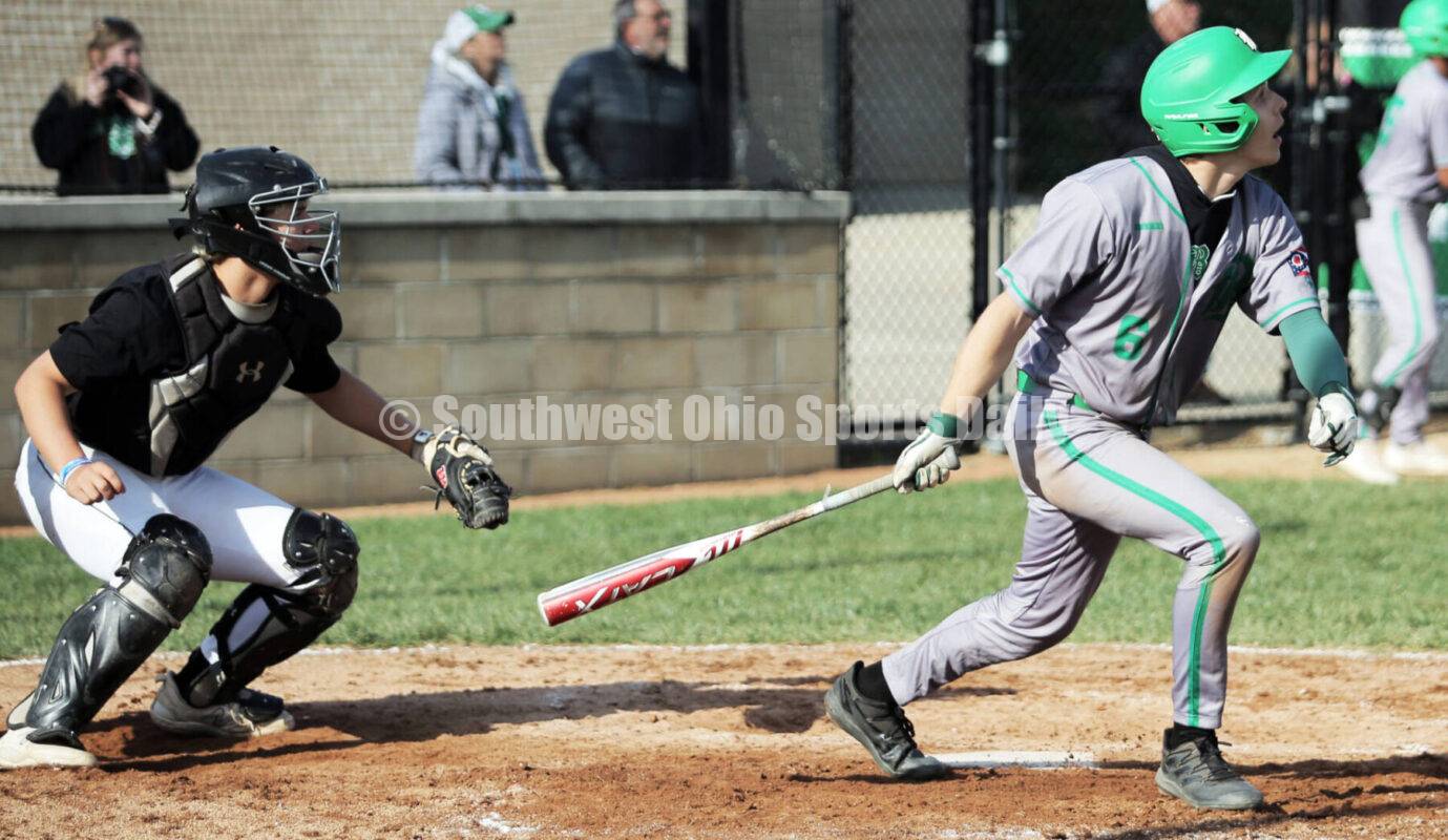 Badin High School's Brycen Fox connects at the plate April 24, 2023, during a Greater Catholic League Coed Division baseball game at McNicholas. Badin won 9-3. RICK CASSANO/STAFF