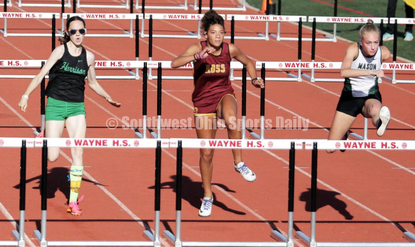 Ross High School's Myah Boze runs between Harrison's Lylla Kovacs (left) and Mason's Lily Eagleston in the girls 100-meter hurdles May 26, 2023, during the Division I regional track & field meet at Huber Heights Wayne. RICK CASSANO/STAFF
