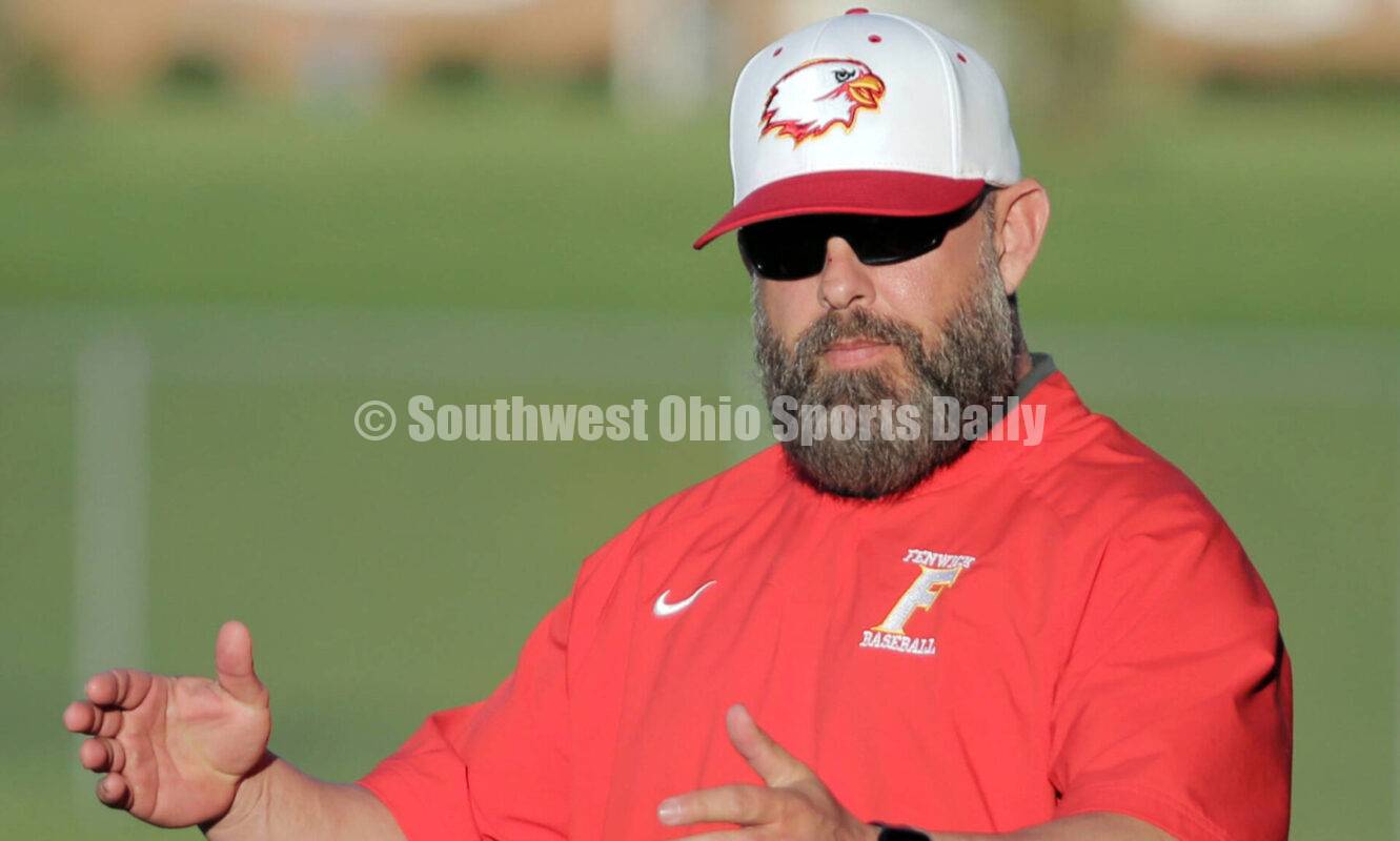 Fenwick High School coach Josh Sams gives instructions April 12, 2023, during a Greater Catholic League Coed Division baseball game against Dayton Chaminade Julienne at Fenwick. The host Falcons won 11-10. RICK CASSANO/STAFF