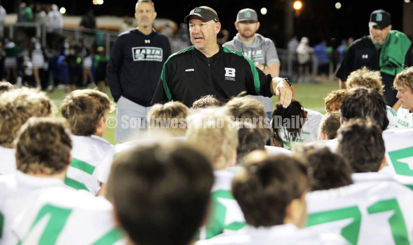 Badin High School coach Nick Yordy talks to his team Oct. 13, 2023, after a Greater Catholic League Coed Division football game against Dayton Chaminade Julienne at Roger Glass Stadium. Visiting Badin won 27-13. RICK CASSANO/STAFF