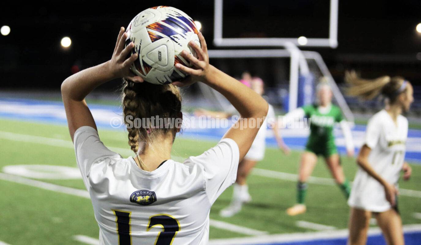 Monroe High School's Gracie Smith prepares to make a throw-in Oct. 23, 2023, during a Division II district girls soccer semifinal against Badin at Virgil Schwarm Stadium in Hamilton. Badin won 2-1. RICK CASSANO/STAFF