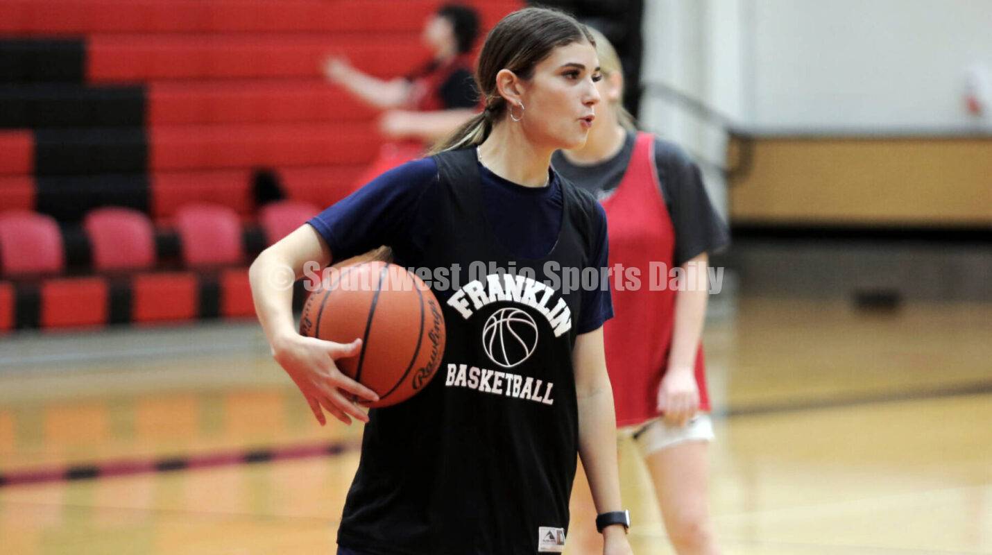 Franklin High School's Addie Berry reacts to a play Nov. 8, 2023, during a girls basketball practice at the school in Franklin. RICK CASSANO/STAFF