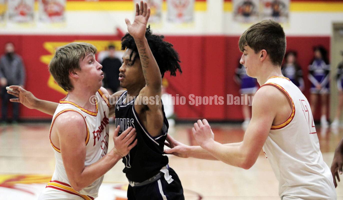 Middletown High School's Michael Maldonado gets between Fenwick's Shaefer Janeck (left) and Joey Costello on Jan. 6, 2024, during a boys basketball game at Fenwick. Middletown won 55-52 in overtime. RICK CASSANO/STAFF