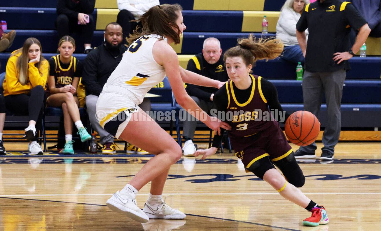 Ross High School's Lanie Lipps drives past Monroe's Ryan Buskirk on Jan. 27, 2024, during a Southwestern Buckeye League Southwestern Division girls basketball game at Monroe. Ross won 52-21. RICK CASSANO/STAFF