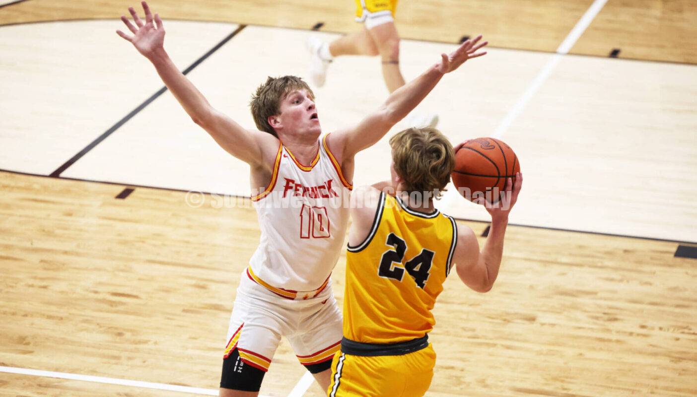 Fenwick High School's Shaefer Janeck pressures Kettering Alter's Joe Brand on Feb. 2, 2024, during a Greater Catholic League Coed Division boys basketball game at Fenwick. The host Falcons won 55-42. RON ALVEY/CONTRIBUTOR