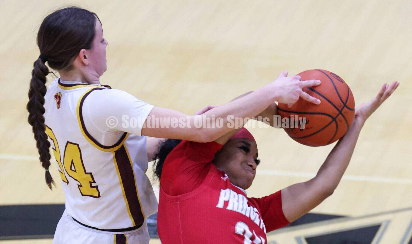 Ross High School's Caroline Chernock tries to get the ball away from Princeton's Heaven Sneed on Feb. 26, 2024, during a Division I district semifinal girls basketball game at Lakota East. Princeton won 53-17. RON ALVEY/CONTRIBUTOR