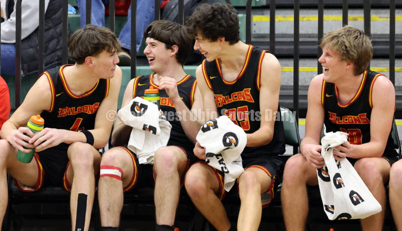 Fenwick High School's (from left) Bailey Temming, Ryan Gavigan, Carrson Sova and Shaefer Janeck share a laugh on the bench Feb. 29, 2024, during a Division II sectional boys basketball game against Bethel-Tate at Mason Arena. Fenwick won 67-30. RICK CASSANO/STAFF