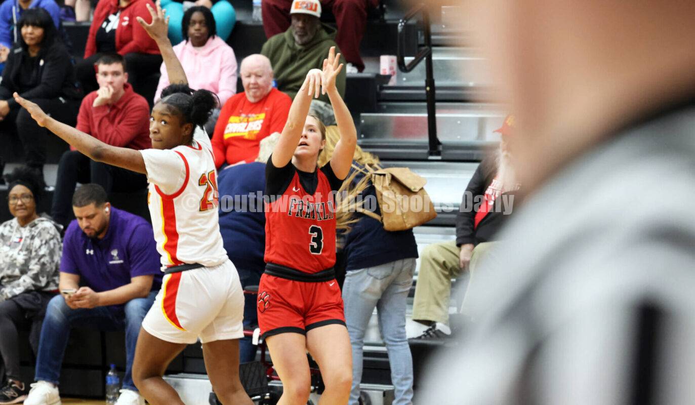 Franklin High School's Kensie Black puts up a shot Feb. 26, 2024, during a Division II district semifinal girls basketball game against Purcell Marian at Loveland. Purcell won 79-32. RICK CASSANO/STAFF