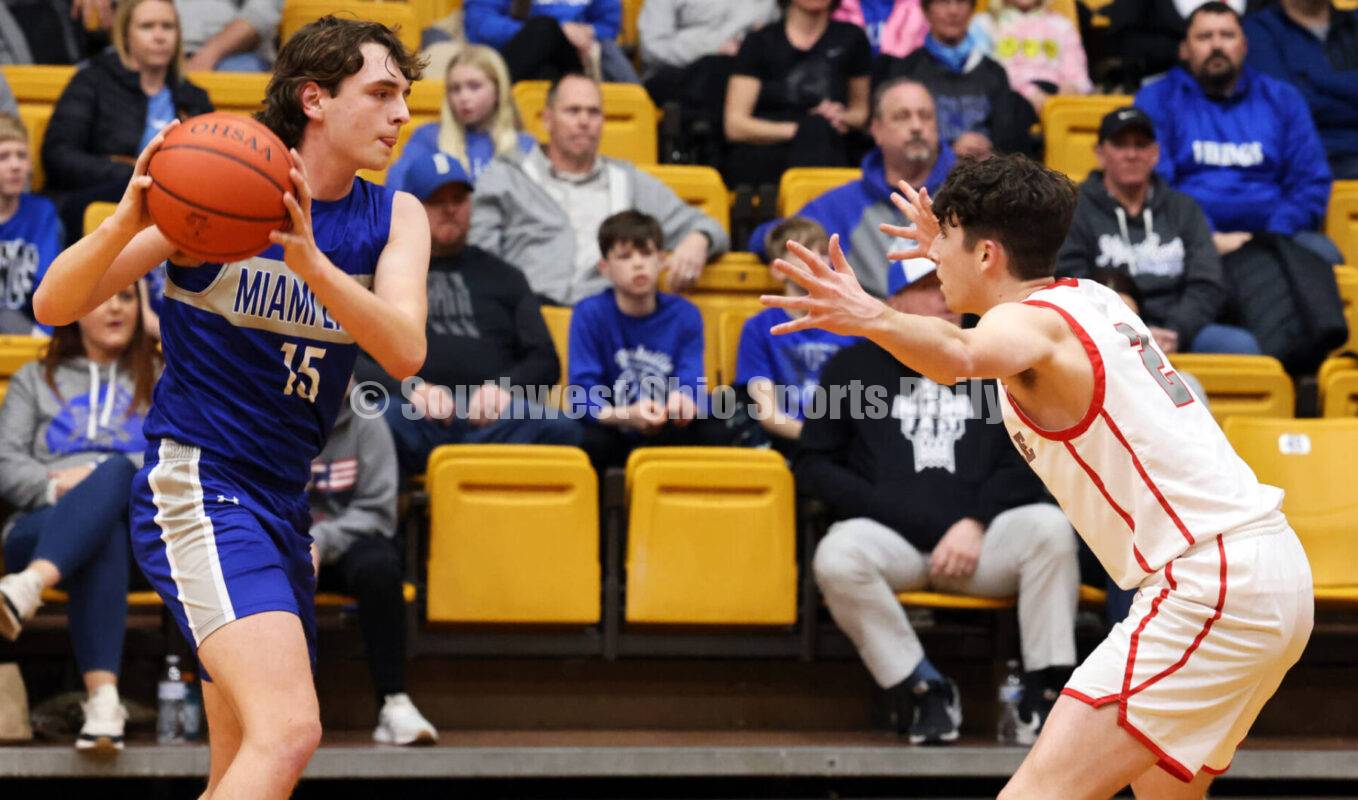 Carlisle High School's Drew Conger guards Casstown Miami East's Connor Apple on Feb. 28, 2024, during a Division III sectional boys basketball game at Vandalia Butler. Miami East won 51-49. RICK CASSANO/STAFF