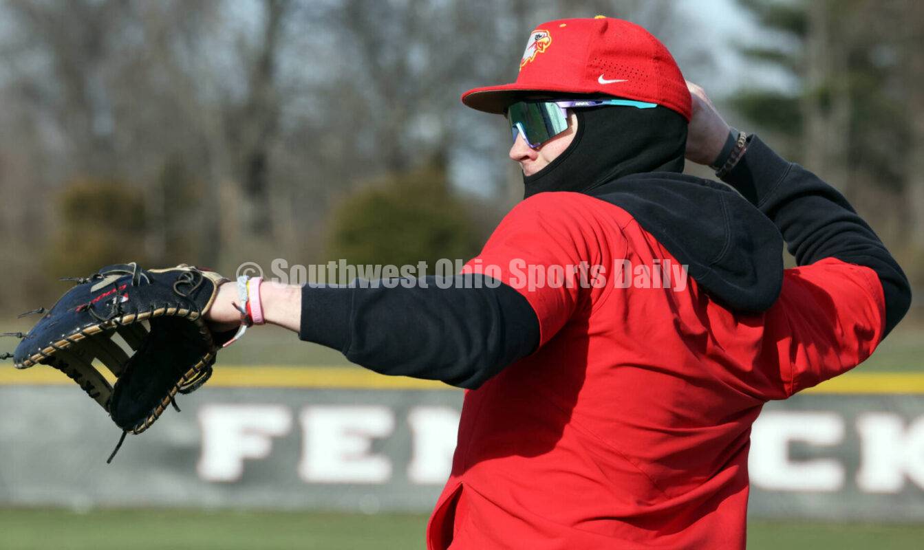 Fenwick High School first baseman Nathan Bachmann winds up for a throw March 19, 2024, during a baseball practice at the school. RICK CASSANO/STAFF