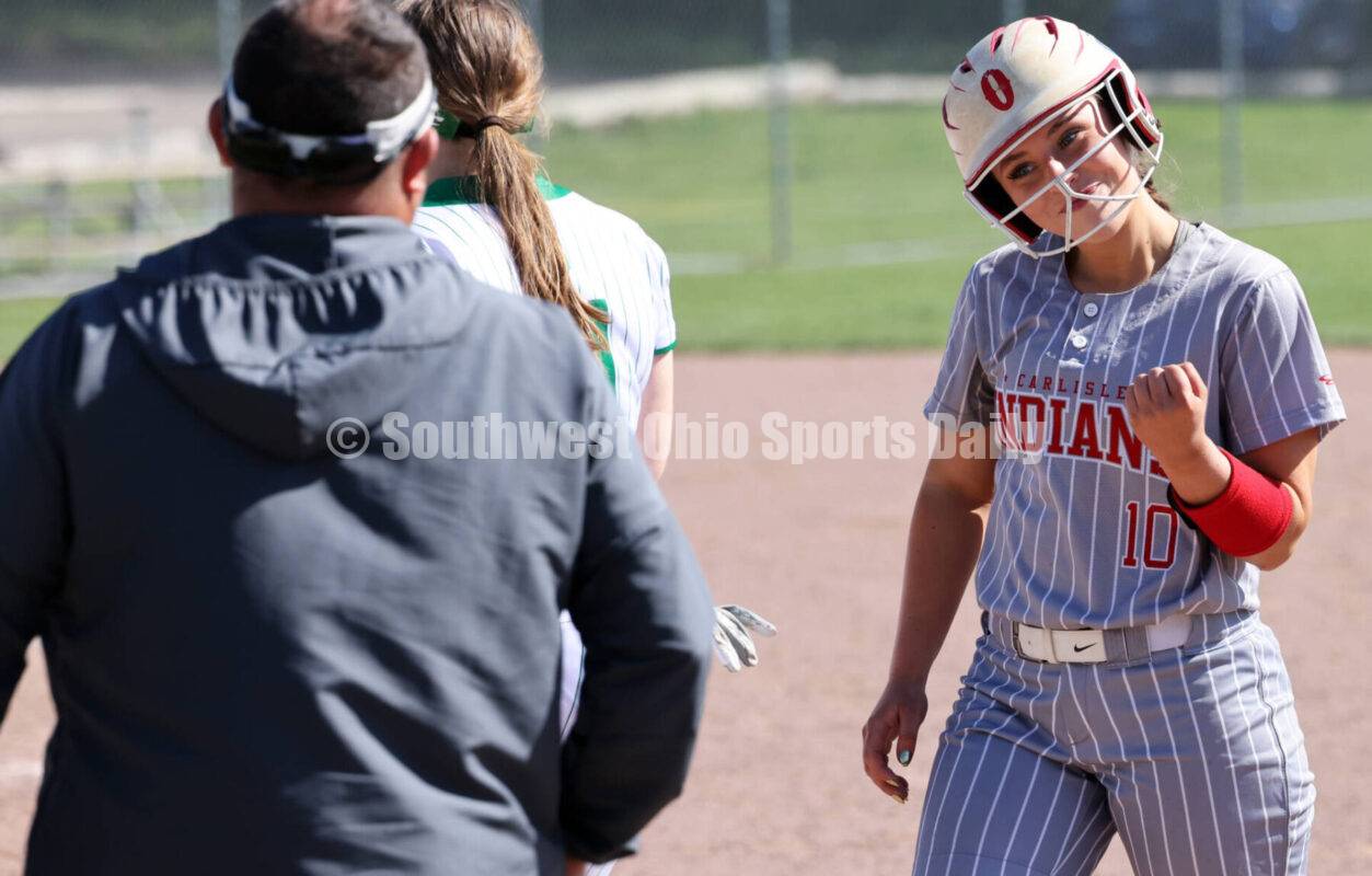 Carlisle High School's Karrigan Bowman reacts to a single at first base April 20, 2024, during a softball game against Badin at Carl Schatt Field in Hamilton. Carlisle won 10-8. RICK CASSANO/STAFF