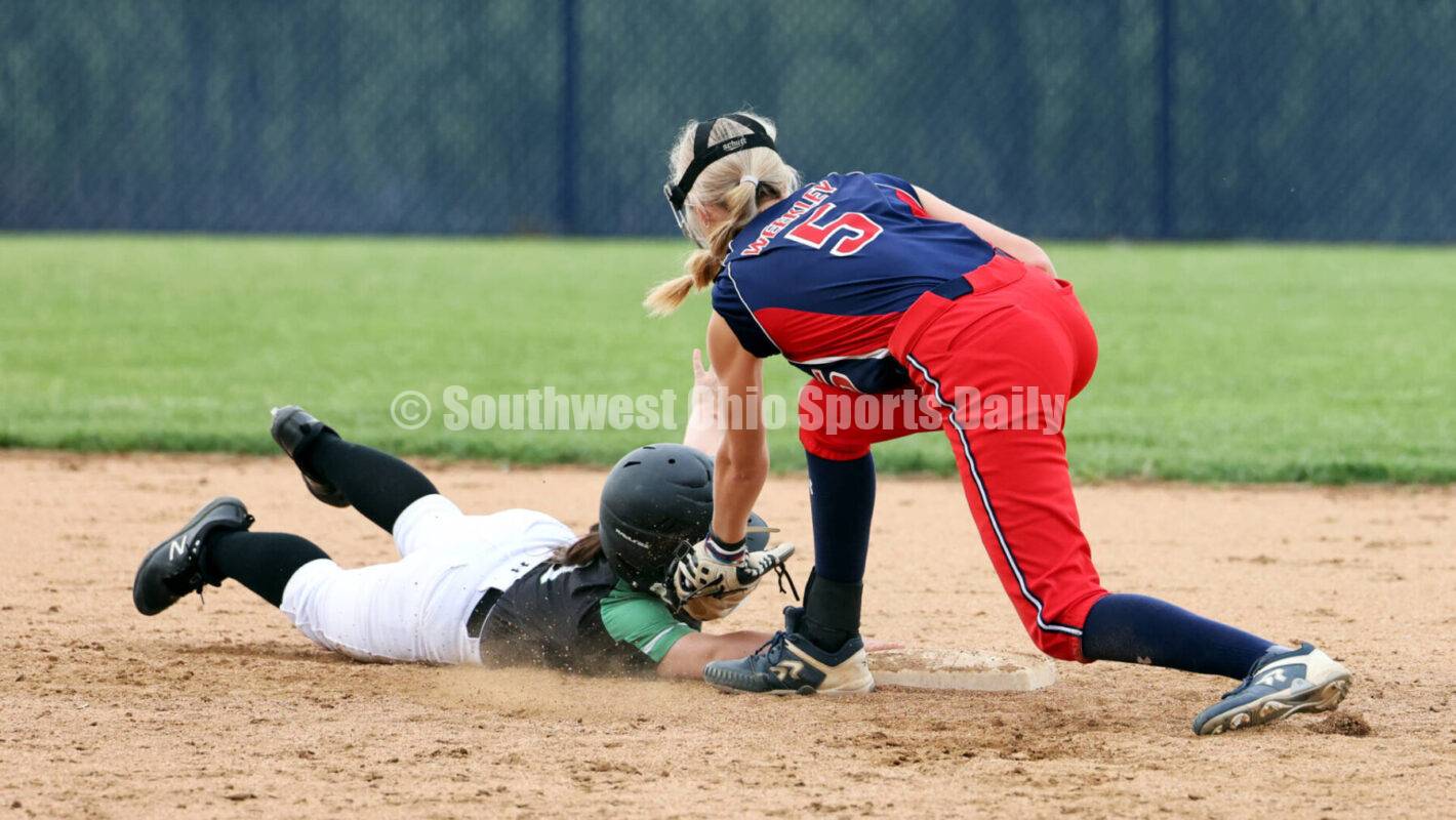 Harrison High School's Hailey Liggett beats the throw to Talawanda's McKenna Weekley at second base May 8, 2024, during a Division I sectional softball game at Talawanda. The visiting Wildcats won 10-4. RICK CASSANO/STAFF