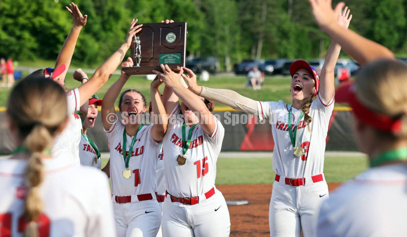 Fairfield High School players celebrate with the trophy May 24, 2024, after a Division I regional softball final against Centerville at Indian Hill. Fairfield won 1-0. RICK CASSANO/STAFF