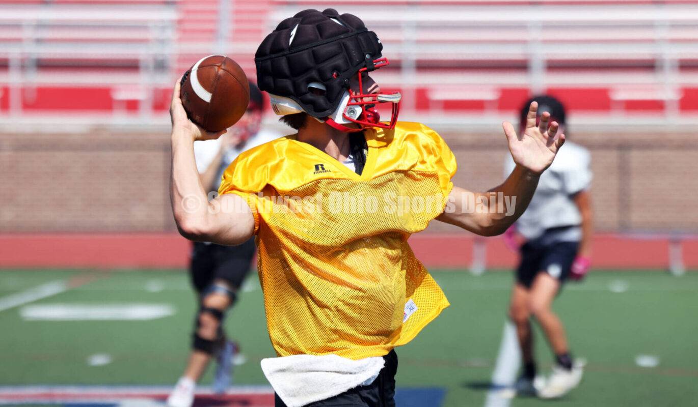 Talawanda High School quarterback Cale Leitch winds up for a throw Aug. 5, 2024, during a football practice at the school. RICK CASSANO/STAFF