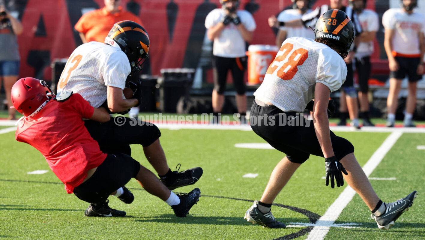 Madison High School's football team (red jerseys) participated in a quad scrimmage against Reading, Norwood and Arcanum on Aug. 9, 2024, at Brandenburg Field in Madison Township. RICK CASSANO/STAFF