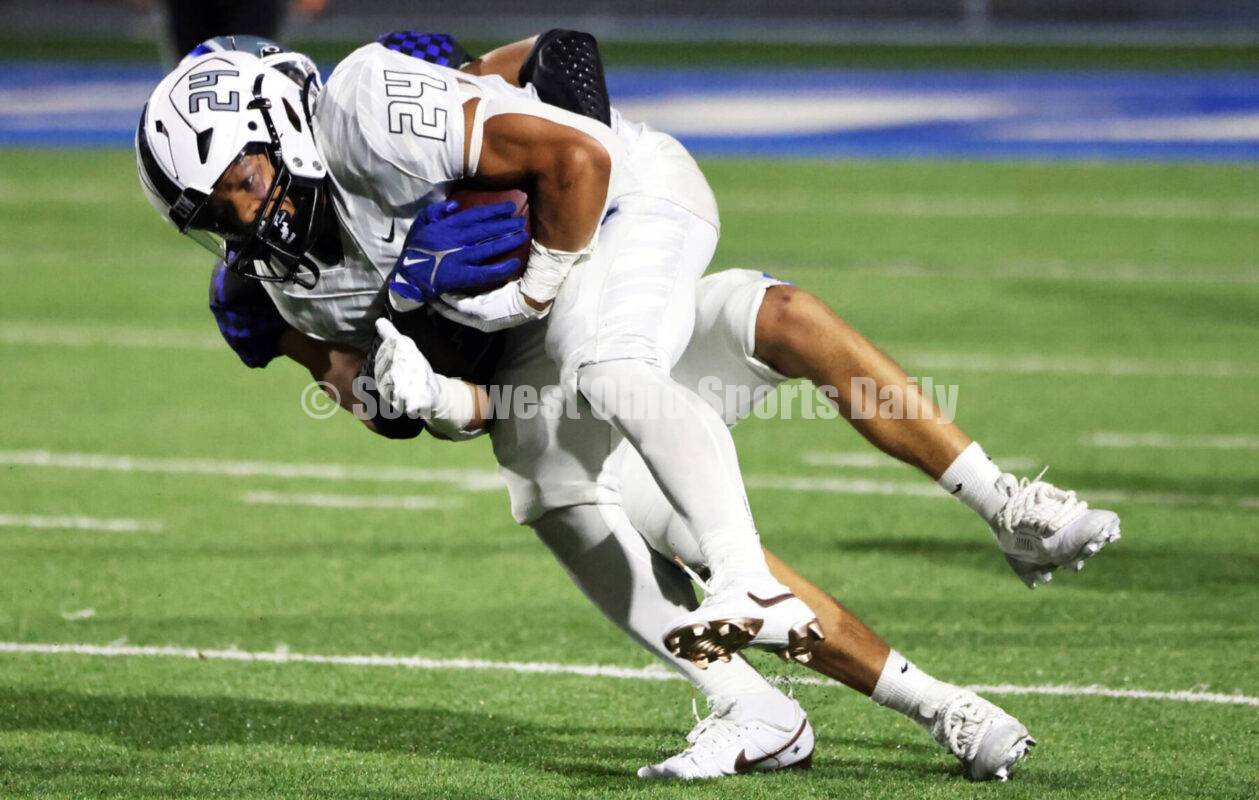 Hamilton High School's Trey Brundidge brings down Lakota East's Ryder Hooks (24) on Sept. 6, 2024, during a Greater Miami Conference football game at Virgil Schwarm Stadium in Hamilton. East won 27-24 in overtime. RICK CASSANO/STAFF