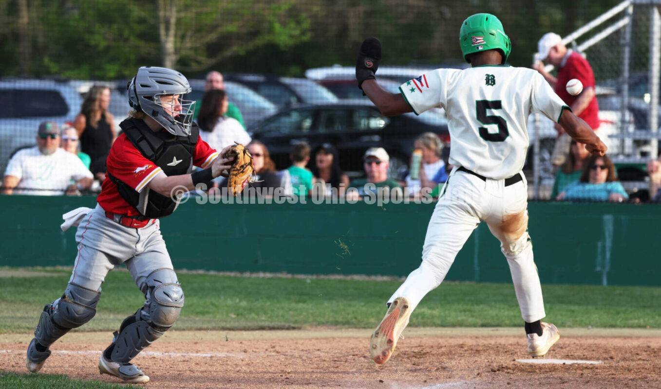 Badin High School's Chandler Taylor runs past Fenwick catcher Nick Bachmann to score a run April 23, 2025, during a Greater Catholic League Coed Division baseball game at Alumni Field in Hamilton. Badin won 10-0. RON ALVEY/CONTRIBUTOR