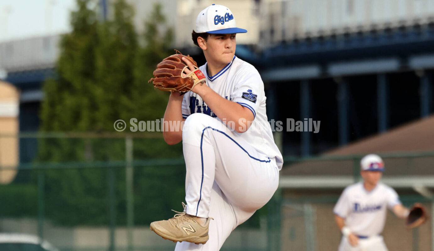 Hamilton High School's Maddox Jones winds up for a pitch May 10, 2025, during a baseball game against Monroe at Hamilton. The host Big Blue won 6-3. RICK CASSANO/STAFF
