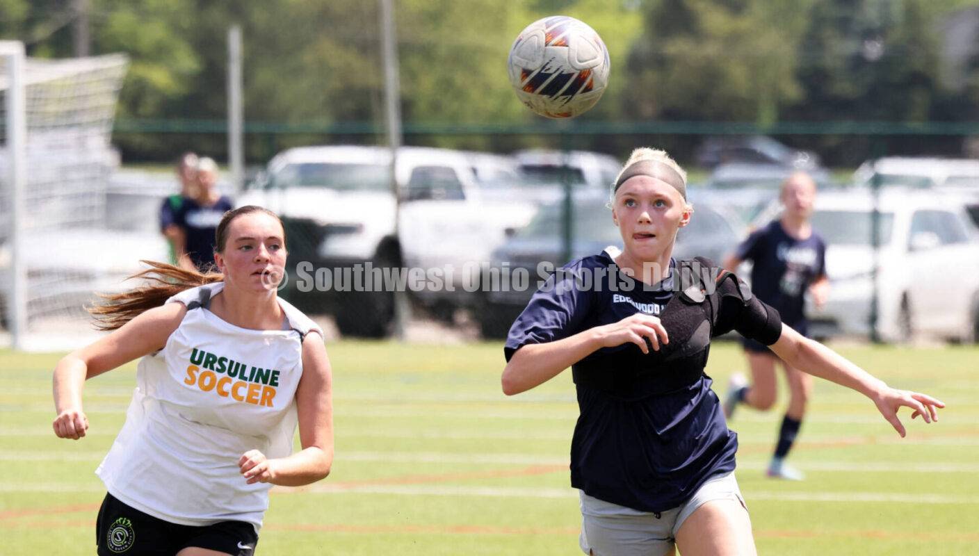 Edgewood High School's Madison Verhoff (right) eyes the ball near the sideline July 11, 2025, during a Midwest Preseason Classic girls soccer game against Ursuline Green at Mason. Ursuline won 7-0. RICK CASSANO/STAFF